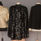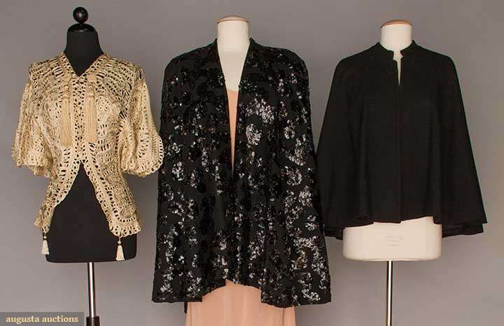 2 1940 black wool: 1 sequined 3/4 length cape & 1 short "Claire McCardell", exc; 1 c. 1900 ecru battenburg lace, exc
