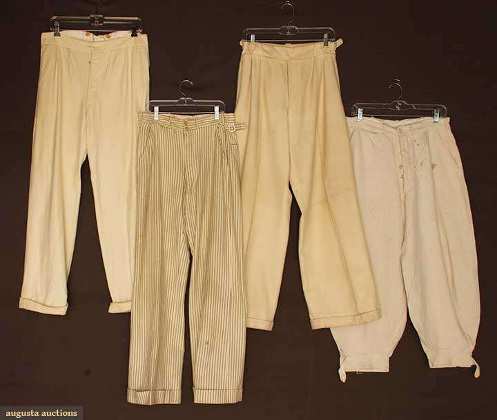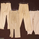 1 pair cream linen plus-fours, stained & 3 pair cream wool, 1 w/ navy pinstripes; some moth holes