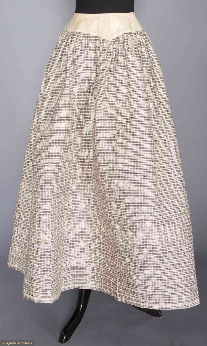 Cream cambric V-shaped & boned W band, brown windowpane on white silk, diamond pattern hand quilting, brown plaid silk lining, W 30", L 38", excellent.