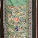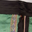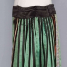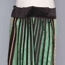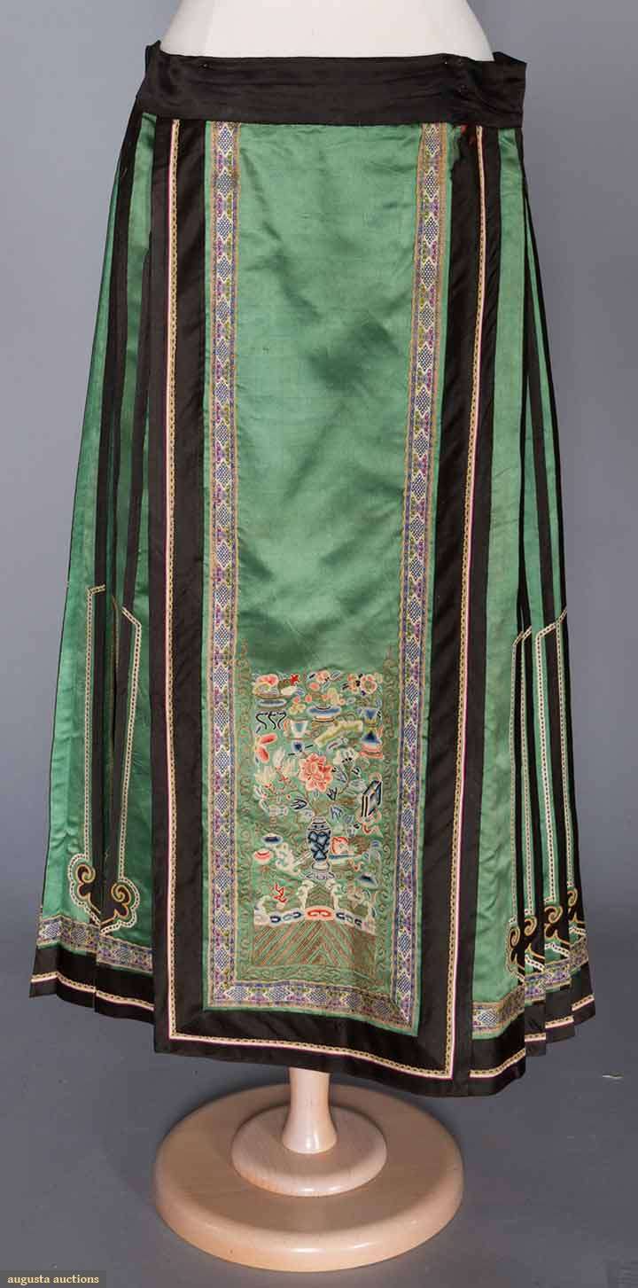 Celadon satin, black satin trim to pleats, CF & CB panels w/ Peking knot embroidery, W 29", L 35", (black skirt trim torn at W, W band replaced) very good.