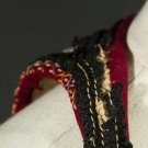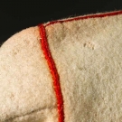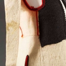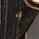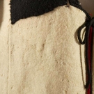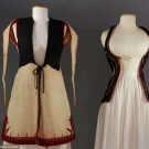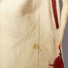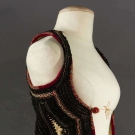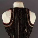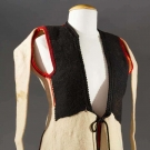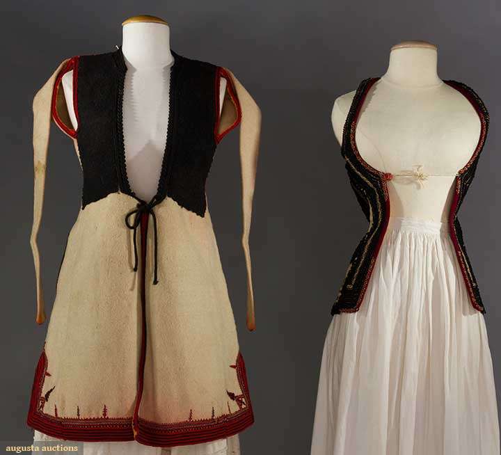 Both white boiled wool & sleeveless: 1 hip L w/ black & red embroidery, L 23", (black soutache missing on back) & 1 thigh L w/ black & red embroidery, vestigal sleeves, L 34", (red fugitive dye & moth holes) both fair.