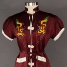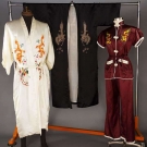 1 white & 1 black silk robe w/ large embroidered dragons, the white also w/ embroidered phoenix, both robes L 50", (press mark on back black robe, few very small stains on white), very good; 1 pair marroon pajamas, B 36", W to 29", Inseam 25", excellent.