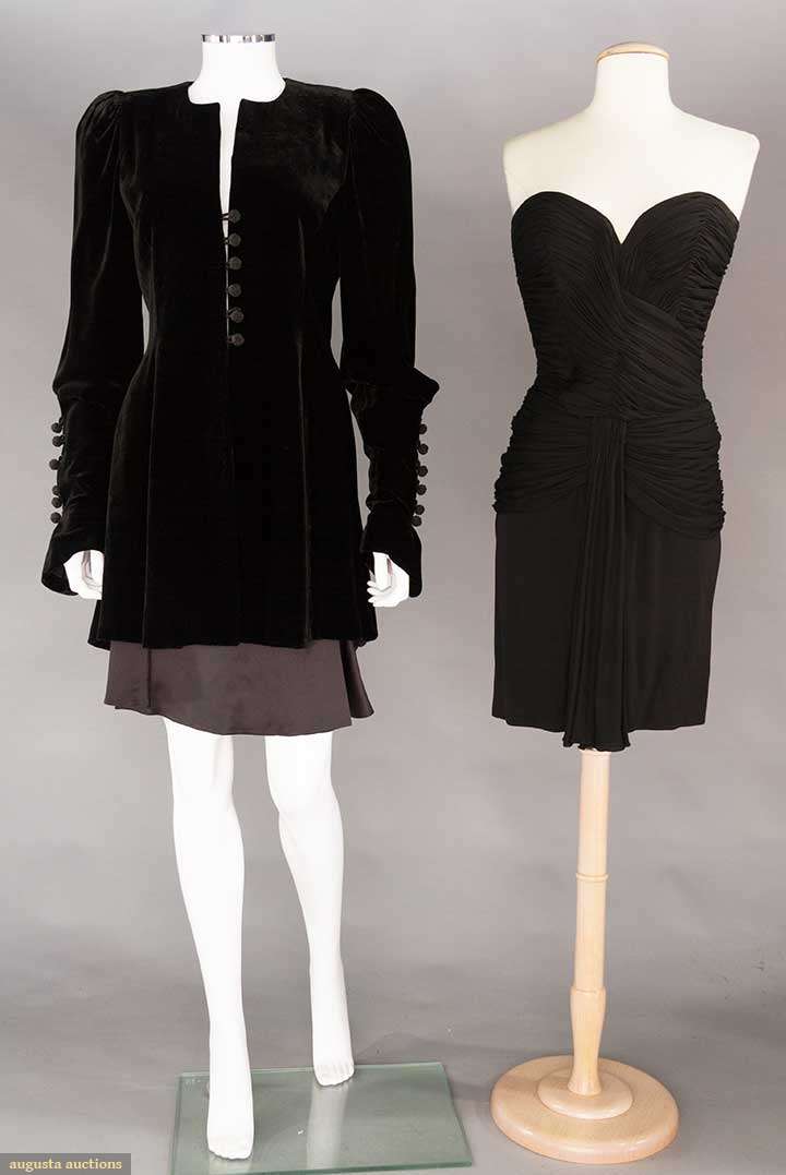 2 "Amanda Wakeley": 1 black velvet mini-dress/tunic, deep V front, midieval sleeves, B 36", W 30", L 33" & 1 black charmeuse short skirt, W 27", L 19.5"; 1 "Vicky Tiel" strapless black jersey knit evening dress, draped fabric worked in tiny pleats, B 33", W 25", CFL 26", excellent.