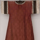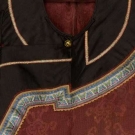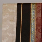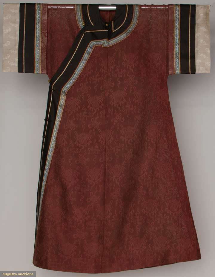 Aubergine silk, side closure, bands of black satin & woven blue, L 52", (tuck in each sleeve to shorten, small hole to 1 sleeve & one 3" mend) very good.