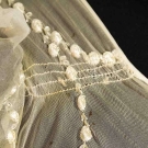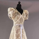 1 white leno weave brocaded in white garlands, blue ribbons, B 36", W 26", L 60", (few tiny stains & pin holes to bodice); 1 yellow silk faille, sleeveless, gold leather belt, B to 36", W 25", L 64", (neckline resewn, attached bra not original) very good.