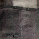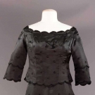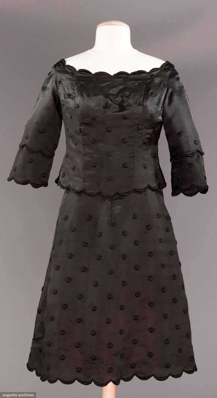 Black silk 2-piece w/ large dot embroidery & scallop edges, label "Christian Dior Paris" stamped "13468", (holes in silk under shirt, seams altered to enlarge) very good.
