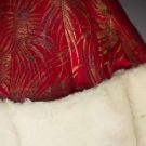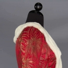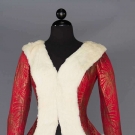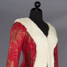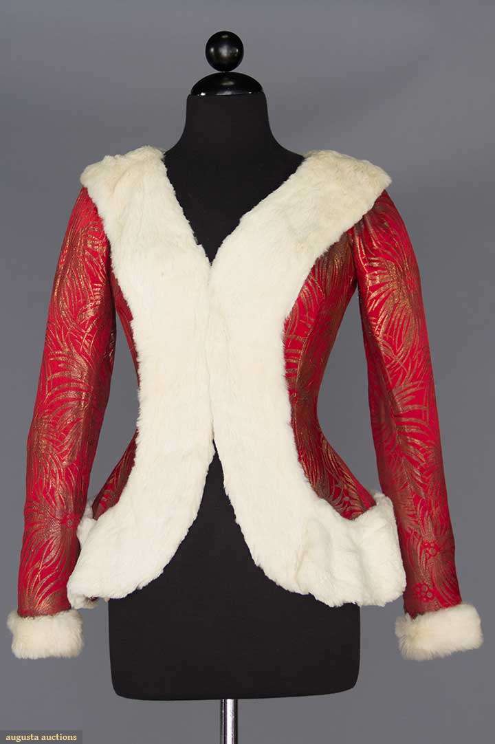 Tomato red satin w/ gold lame starbursts, white fur trim, B 34", W 26", L 22", (fabric pulls, tarnish spots) very good; t/w 1 black wool crepe jacket, pin-tucked in wavy horizontal pattern, very good.