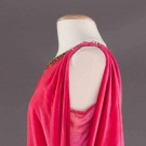 Sleeveless, scoop neckline w/ rhinestone trim, 2 jewelled elements at side H w/ soft folds beneath, B 42", H 40", L 52", (on right side open seam & missing stones on left side opening, slip straps worn & underarm stains on pink charmeuse slip) very good.