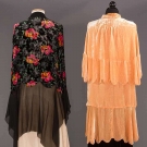 1 printed black velvet cut to chiffon, L 29", B 35", (small hole to R side) very good; 1 peach w/ scalloped flounces, B 37", L 29", (scattered foxing) fair.