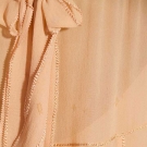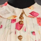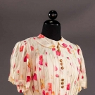 1 white w/ yellow & pink poppy print, knife pleating throughout, original slip, B 33", W 29", H 38", L 41.5", (small stain under slip, plastic buttons damaged); 1 striped pale peach w/ matching jacket, CF bow, label "Vendel", B 32", W 30", H 36", (small light stains to chest & near H) both very good.