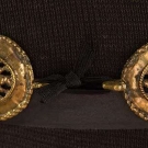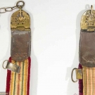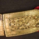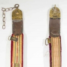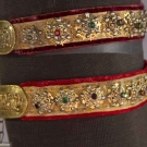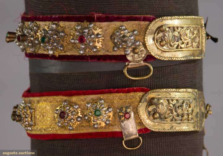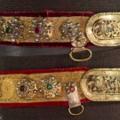 Both belts of red velvet & gold woven strips, decorated w/ graduated circular brass tiers & red or green jeweled tops, chased heavy brass buckles, 32" w/o chain, (1 missing brass element & 1 missing brass chain, some wear to velvet) fair & very good.