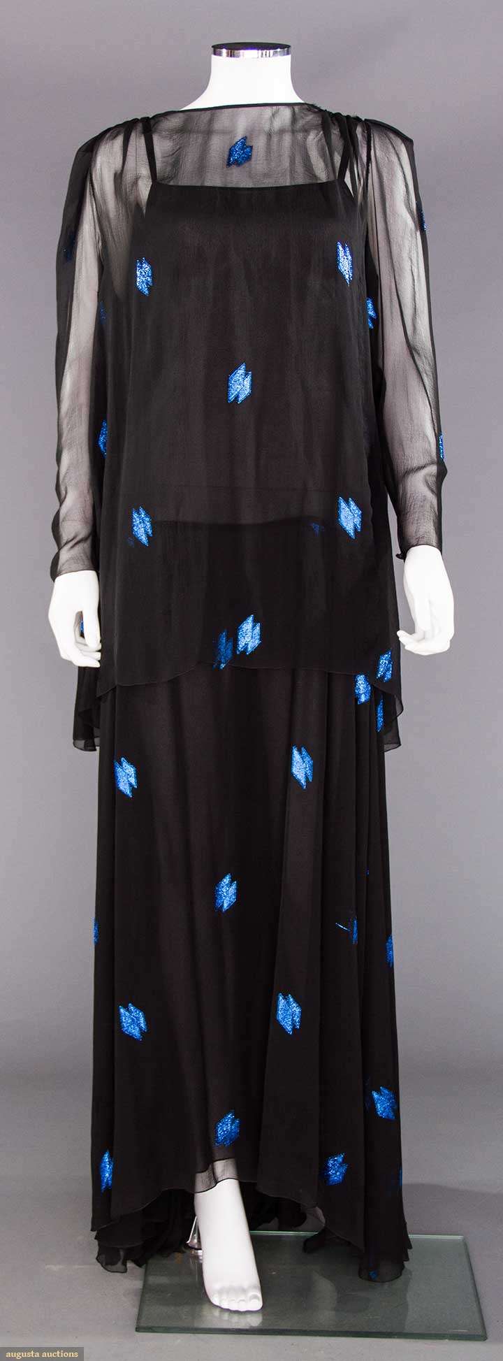 Sheer black chiffon dress w/ spaghetti straps, double layer chiffon skirt brocaded w/ metallic blue lame designs, brocade long sleeve tunic over-blouse, label "Christian Dior Boutique Paris", B 38", H 39", L 54"-61", (small opening at each shoulder seam) very good.