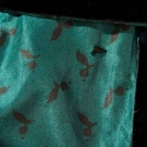 Forest green taffeta w/ all-over small black print, bodice w/ polonaise peplum over bustle skirt, black dome buttons, torchon bobbin lace & black velvet trims, B 36", W 28", Skirt L 39", (small tear on back of top, torn lace, beaded appliques on both sleeves original?) very good