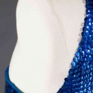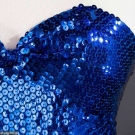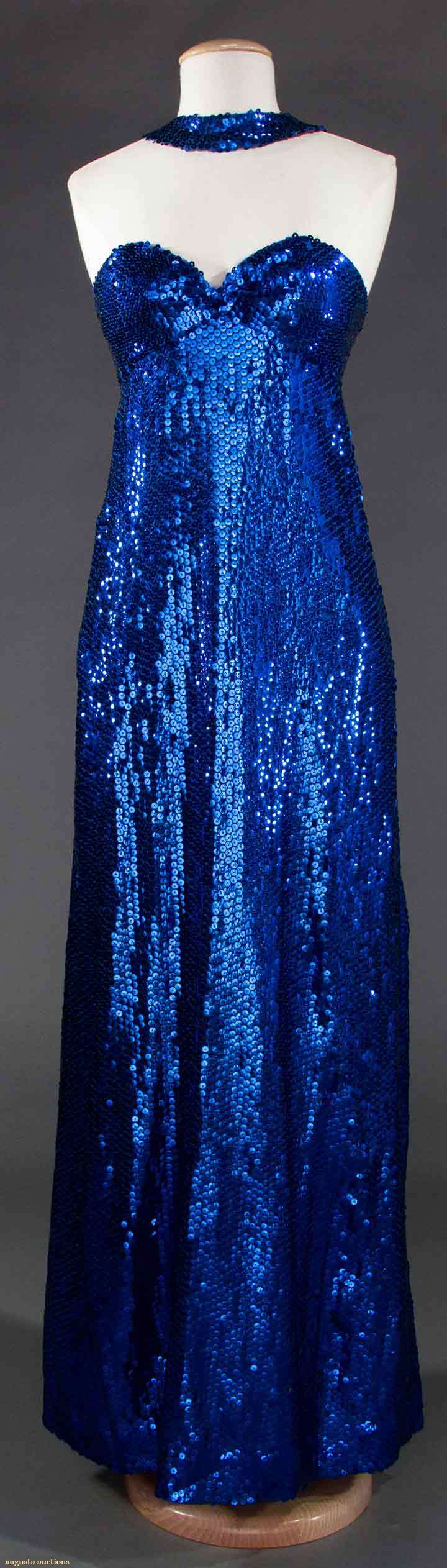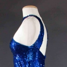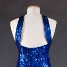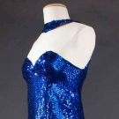 Cobalt blue strappless empire gown, halter strap from back & across neck, built in underwire bra, B 34", W 29", H 40", CFL 49", (faint stain right under arm, sequin losses) very good.