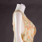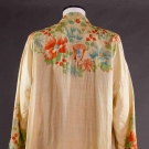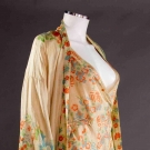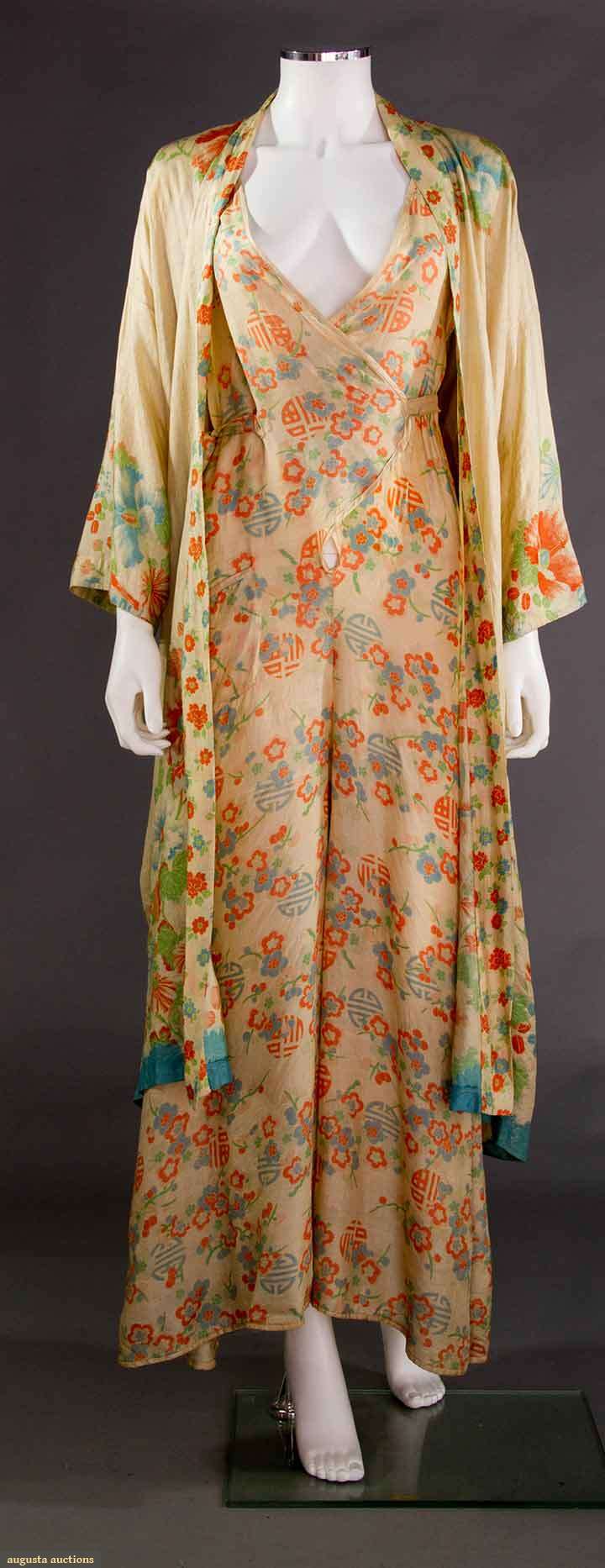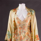 Beige silk w/ blue, orange & green print, 1-piece pajama, sleeveless, palazzo pants; 1 similar print open-front robe, B 32", W 30", H 36", Inseam 21", Robe L 55", excellent.