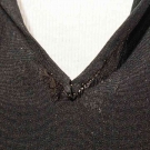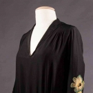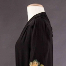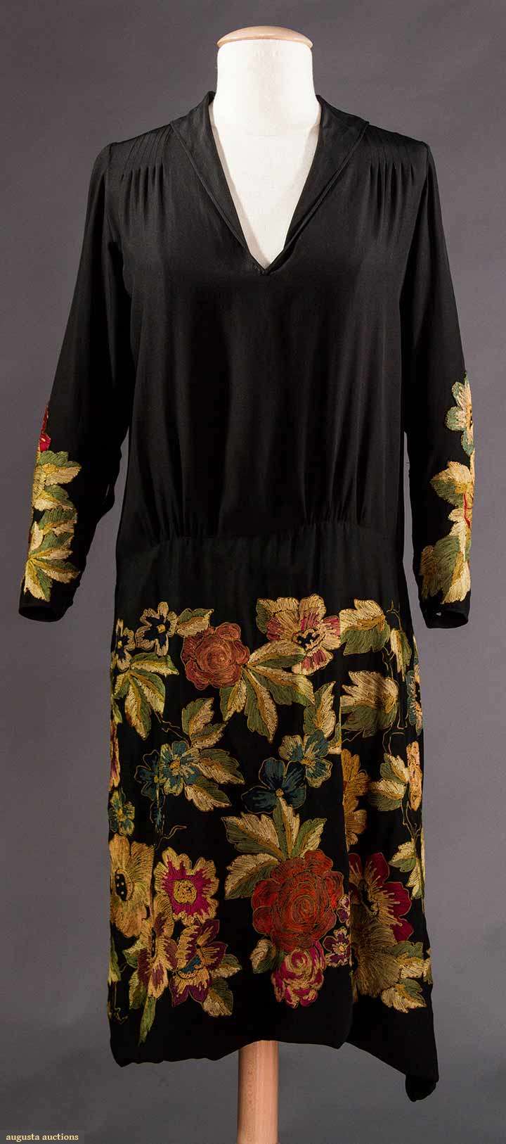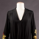 Black silk, V neck bodice, drop waist, long sleeves, skirt w/ floral embroidery in autumn colors, B 34", Low W 34", L 40", (tiny hole CF neckline & on shoulder, hem down, sleeve seam 1.5" unstitched) very good.