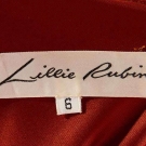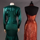 Both labeled: 1 Lillie Rubin rust silk jersey covered in copper sequins, halter neckline w/ low back, B 36", W 26", H 38", L 51", (some sequin loss) very good; 1 Norma Kamali emerald green satin dress, V neck, flounced collar, dropped W skirt w/ 4 tiered flounces, B 38", W 29", H 36", L 52"-61", excellent.
