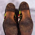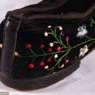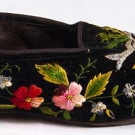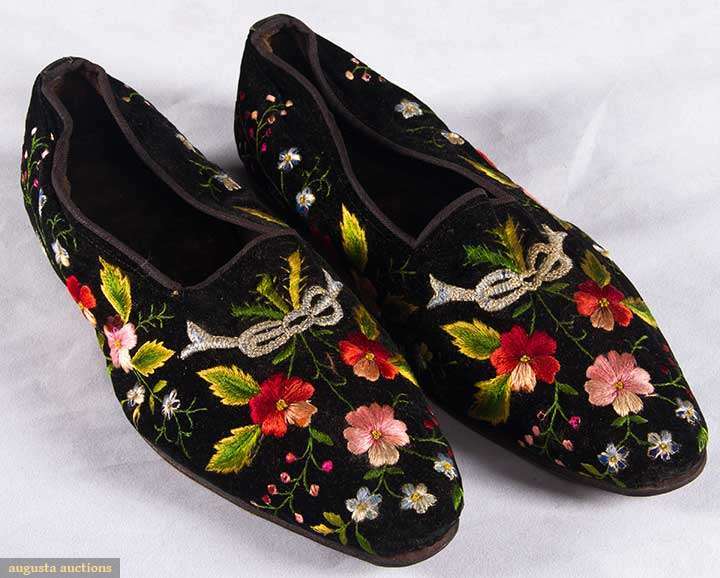 Black velvet, silk floss embroidered flowers & berries, leather soles & lining, 10.75" L, 3.5" Wd, (leather linings worn) exterior excellent.