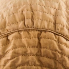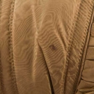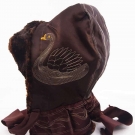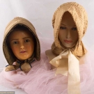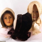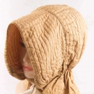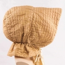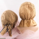 1 tan, piped & channel-quilted, deep brim, beige silk lining, chin-tie ribbons; 1 olive moire, piped & quilted edges, CB satin bow & chin-ties, glazed brown cotton crown lining, both excellent; t/w 1 brown fur hood w/ stitched swans on lining.