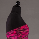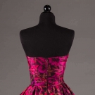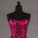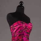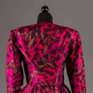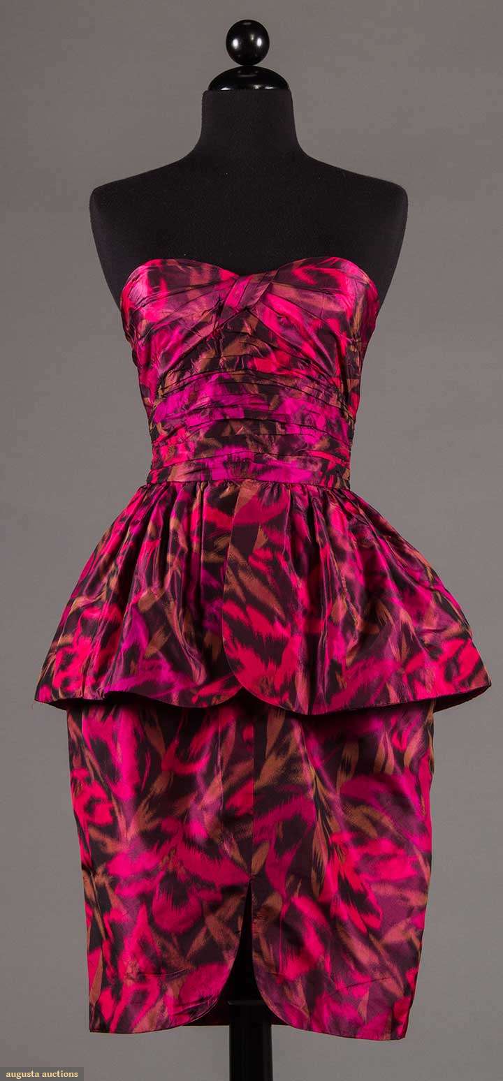 Red, hot pink & black silk taffeta warp print, strapless, long peplum w/ pockets, tulip short skirt, matching jacket, labeled, B 34", W 25", H 44", CFL 31", (small dark stain & narrow long snag on jacket back) very good.