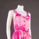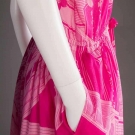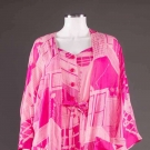 Hot pink print on light pink cotton voile, draw-string tie W, wide palazzo pants w/ pockets, silk lining, loose kimono style coat, B 38", W 30", L 60", excellent.
