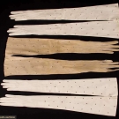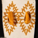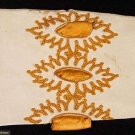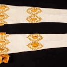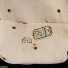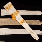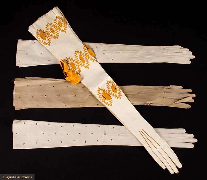 All unworn: 1 pair cream kidskin w/ gold tambour embroidery & gold silk ribbons, L 27", (couple stains & nicks); 3 pair grey fine suede w/ faceted small steel studs, L 22.5", (2 pair w/ few tiny rust spots) very good-excellent.