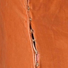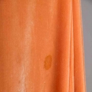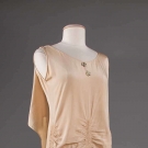 1 peach silk velvet, cloth flower trim, B 33", W 23", L 56" (couple light brown skirt stains); 1 beige taffeta w/ ruched midriff, B 36", H 38", L 45"-54" (holes made by CF paste pin, light stains) both fair.