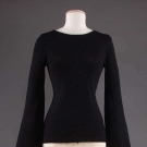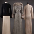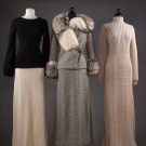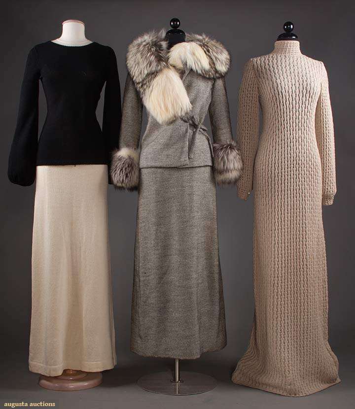 1 B&W wool maxi dress & matching jacket w/ fox fur trim, B 34", W 30", L 55", (hole on lower right side) fair; 1 taupe wool cable knit maxi dress, L 52", (large brown stain on lower back) fair; 1 black knit sweater w/ balloon sleeves & matching white knit skirt, B 38", W 28", Skirt Length 44", excellent.