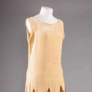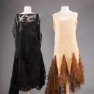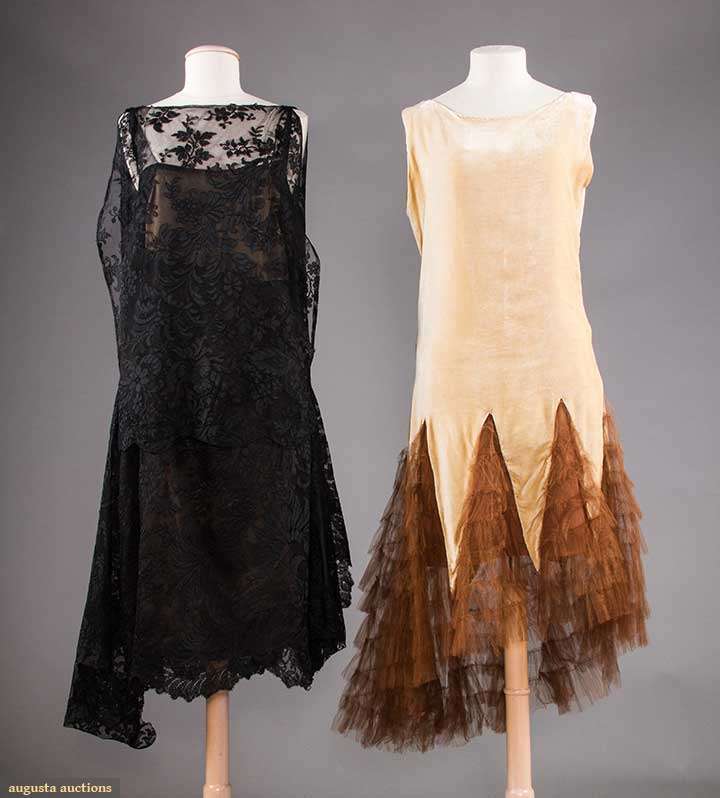 1 tan silk velvet w/ brown tulle hem gores, B 32", H 35", L 41"-47", (few light stains on velvet, few holes in tulle); 1 black Spanish lace, multiple tiers, B 40", L 45", (small tears at neck, underdress shoulder strap detached) both fair.