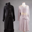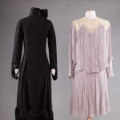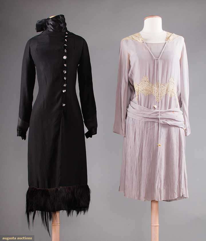 1 lilac chiffon w/ lace insertions, B 34", H 36", L 39", (stained underarms, brown stains on left side & sash) fair; 1 black silk crepe, black fur trimmed hem, off-center black plastic & rhinestone buttons, B 32", W 26", H 36", (1 missing button & 1 small stain) very good.