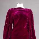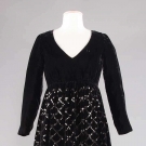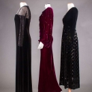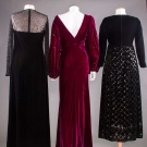 1 1930s wine silk velvet, balloon sleeves w/ sequin trim, low V back, W 28", H 38", (seams need restitching, pile worn & hem edge frayed) fair; 2 black velvet: 1 "Bill Blass" empire w/ black sequin trim in lattice pattern, B 34" & 1 velvet column w/ jet beaded black mesh bodice & sleeves, B 40", W 34", both excellent.