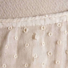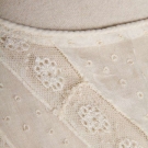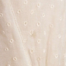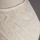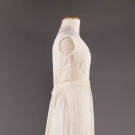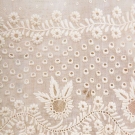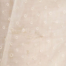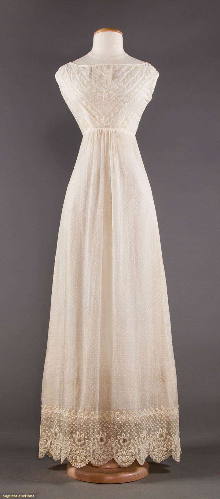 Hand embroidered tiny white circles, empire bodice w/ Val lace, scalloped deep hem border, heavily embroidered in wavy floral & garland patterns, B 32", Hi W 22", (bodice w/ many small holes & 1 large tear, sleeves missing) bodice fair, skirt excellent.