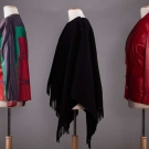 1 "J.C. de Castelbajac" black wool fringed poncho, excellent; 1 "Lowe" red lambskin jacket, W 32", (small stains to 1 shoulder) very good; 1 "Valentino" boxy leather in purple, red & green patterns, (few stains & dirty) very good.
