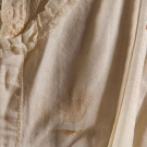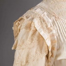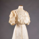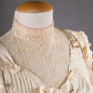 2-piece & petite, high neck, embroidered lace & cream silk ribbon trims, B 36", W 23", (some tiny stains) excellent; t/w 1 1898 cream wool challis 2-piece dress, (many moth holes).