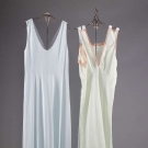 All synthetic fabrics, 2 bed jackets: 1 peach & 1 blue; 4 negligees: 1 ble, 1 pale green, 1 pink, 1 black