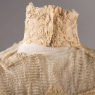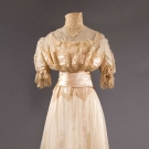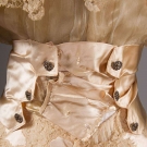 2-piece champagne silk satin, chiffon over-lay w/ hand-made Brussels bobbin lace trims, 6 diamante & metal filigree buttons on sash back, B 34", W 23", label "Louise Borges Astor Court", (splits in satin, chiffon dirty & torn at back neck, stains) fair.