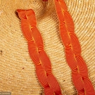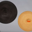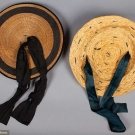 1 floppy natural straw w/ navy ribbons; 3 flat straw hats w/ tiny peaks: 1 natural w/ orange ribbons (many pin holes), 1 solid black & 1 tan straw w/ black ribbon trim, (some wear) all very good-excellent.