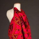 1 dark brown organdy evening skirt, printed diagonal floral bands w/ overlay of gold gilt hand-stenciled kelp patterns, unlabeled, W 27", Skirt L 43", (4" tear at hem) very good; pantsuit in red & dark pink print, long cross-over jacket, bell bottom pants, labeled, W 30", Ins 28", Jacket L 38", excellent; 1 unlabeled sarong skirt in fuchsia, purple & green print, excellent. PROVENANCE: DOROTHY CUMMING McNAB, silent film actress & sister of Rose Cumming, legendary early 20th C NYC interior designer.