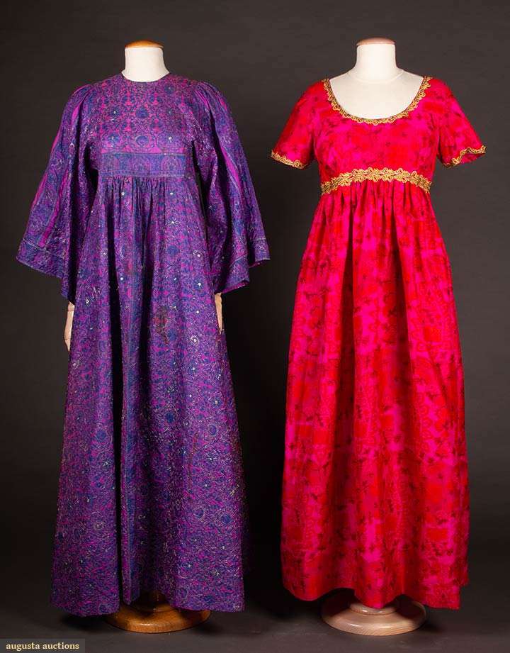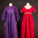 Both empire: 1 magenta w/ purple print & couched gold thread outlines, labeled "Dorothy McNab, Montigo Bay", B 36", High W 32", L 57", (stains throughout, large stain at CF skirt) poor; 1 fuchsia, covered in mottled red floral pattern, beaded metallic gold trim, labeled "Dorothy McNab, Montigo Bay", B 40", High W 32", L 56", excellent. PROVENANCE: DOROTHY CUMMING McNAB, silent film actress & sister of Rose Cumming, legendary early 20th C NYC interior designer.