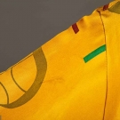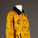 Mustard yellow ground in cotton-silk blend w/ alphabet print in various fonts & colors, 2 over-size patch pockets, black velvet collar, labeled, FR. Size 38, L 35", black lining, (tiny pin stains to 1 sleeve, pale stains by shoulders & by 1 cuff) very good.