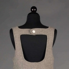 Light grey wool, very low U front & back necklines, 2 patch pockets, large white snaps, label "Courreges Paris" w/ stamped couture #45197", B 37", H 40", L 45", (1" x .5" stain, many moth snacks, small hole at under arm) fair.