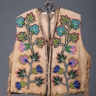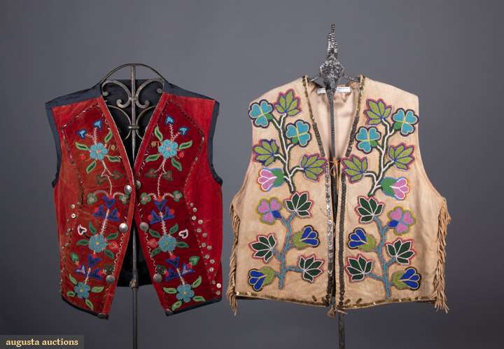 Both w/ beaded appliques removed from older garment: 1 red velvet w/ floral bead bands & Indian head coin buttons, L 21”, (some fading); 1 pre-1900s tan elk hide w/ Blackfoot &/or Arapaho beadwork, front w/ floral beadwork & back w/ beaded panels, sides & back fringed, L 21”, (lining replaced, pieced from coat & tipi bag, some color bleed, minor bead loss) both vests very good.