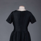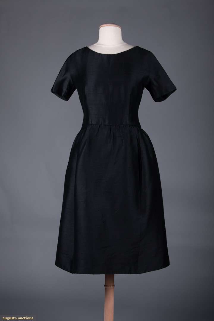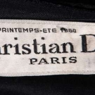 1-piece black silk twill, short sleeve bodice w/ boned midriff foundation, labeled “Christian Dior, Printemps-Ete 1960 105192”, W 30”, B 38”, L 43”, (cluster of small holes 9" from CF hem) very good.