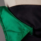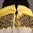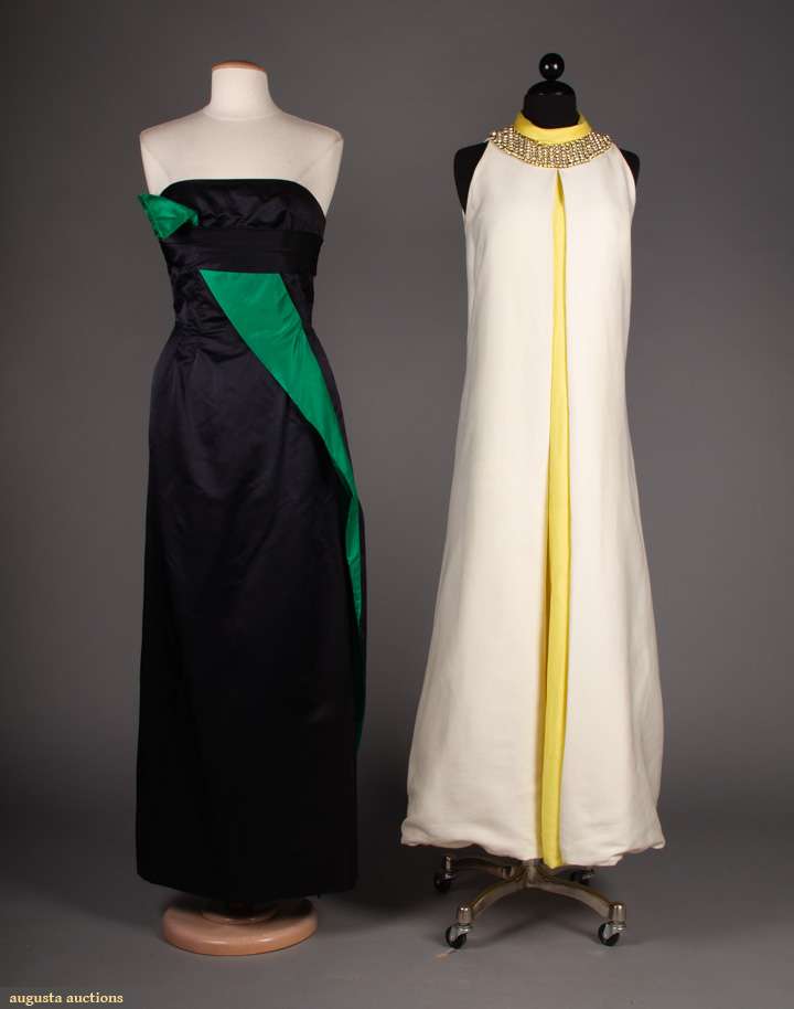 1 "Oleg Cassini" strapless black silk sheath w/ emerald satin ribbon, B 35", W 27", CF L 50.5", (wear to green ribbon end) excellent; 1 white silk gown, single CF inverted yellow pleat, jewelled high neckline, B 36", H 38", L 54", (missing beads at back zipper closure, hem uneven, stains in lower right skirt, pull at right B) fair.