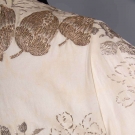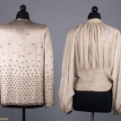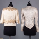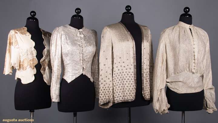 1 bolero w/ gold & silver lame & scalloped edges, L 20", (light stains throughout); 1 silver lame fitted jacket w/ small CF bows, B 36", W 26", L 20", (some tarnishing & stains); 1 silver lame w/ small beaded blossoms, L 27", (fold lines across back, tarnish at back neck, weak spots at right underarm & SH, bead loss); 1 silver lame blouse w/ deco patterned brocade, W 31", L 22", (opening missing hook & eye, tarnish left front sleeve) all fair.