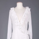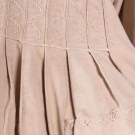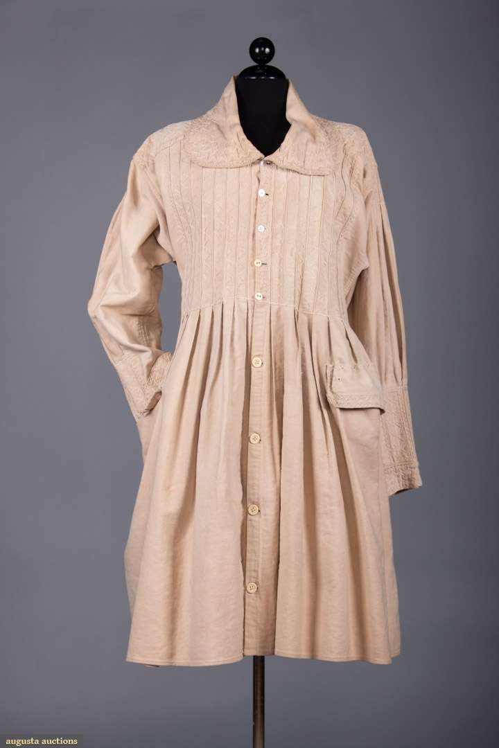 Beige cotton canvas, pleated bodice, 2 pockets, feather stitching on front & back bodice, B 40", W 35", L 40", (small holes in left pocket, light stains throughout, right back H mend) very good; t/w 1 white cotton robe