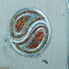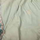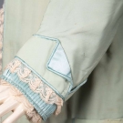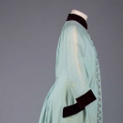 1 light green bustle & trained robe w/ blue silk CF panel, B 36", W 29", L 55"-85", (tiny moth holes, 6" x 7" cream stains in train & at H); 1 baby blue robe w/ maroon velvet cuff, collar & pocket trim, yin yang brocade design at CF, B 36", L 52"- 54", (tiny-1" moth holes throughout, sun fades to right shoulder & sleeve) both fair.