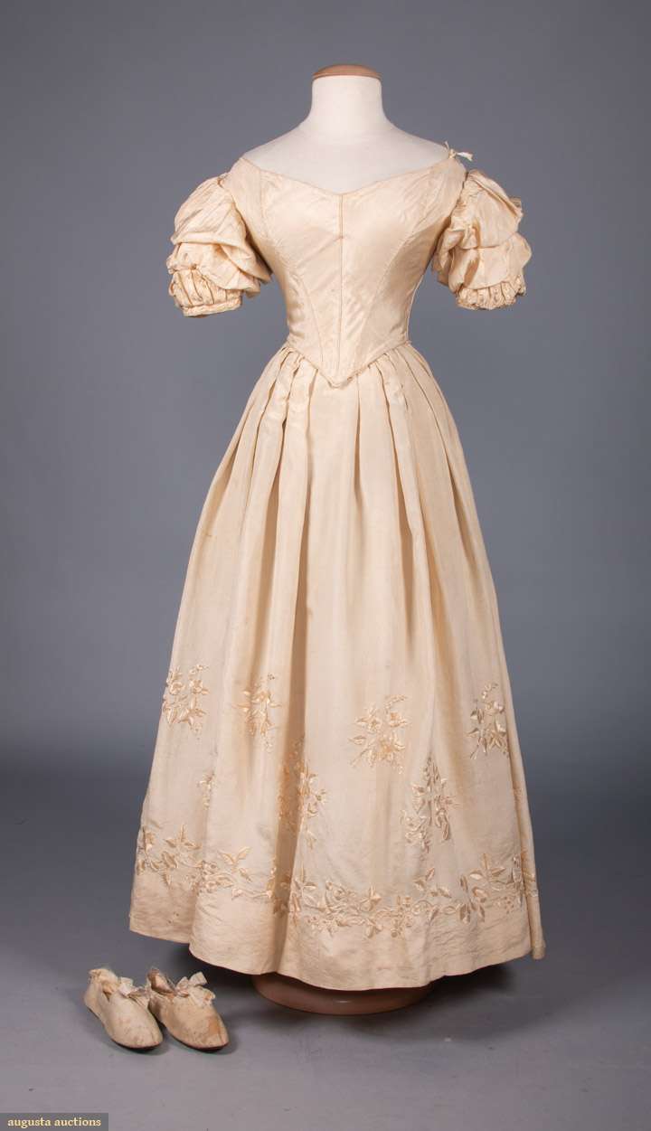 EMBROIDERED SILK WEDDING GOWN, c. 1840