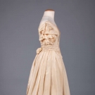 2-pc bone silk twill w/ silk embroidery at skirt bottom & CB bow, short sleeves, CB laced bodice, B 27", W 20", L 50", (light stains throughout, shoulder piping torn, tear to neckline, open seam on sleeve ruffle, stains) fair; t/w extra fabric remnants, 1 pair c. 1820 silk shoes & 1 beige silk gauze 2-pc dress, both poor condition. MCNY.