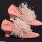 2 pair embroidered Chinese slippers: 1 black & 1 white, both excellent; 1 pair pink quilted & feather boudoir slippers, excellent; 2 pair evening t-straps w/ cutout vamps: 1 pair white satin, excellent & 1 pair gold kid, (few stains) very good; t/w 1 pair Irish crochet wedding shoes.